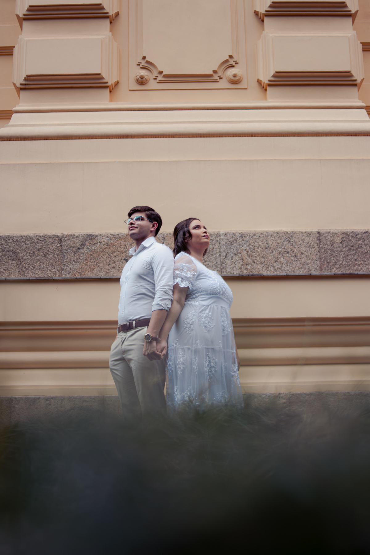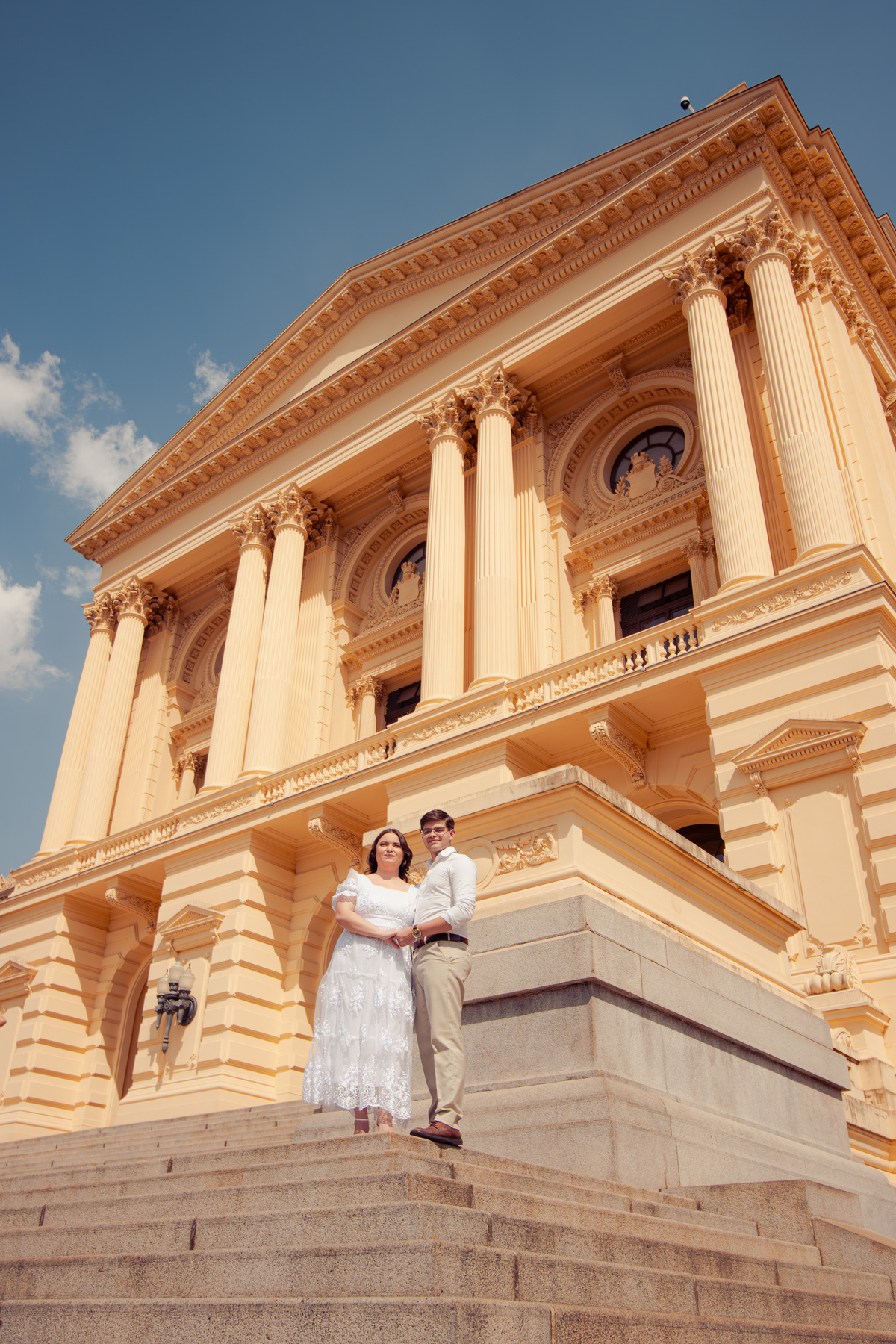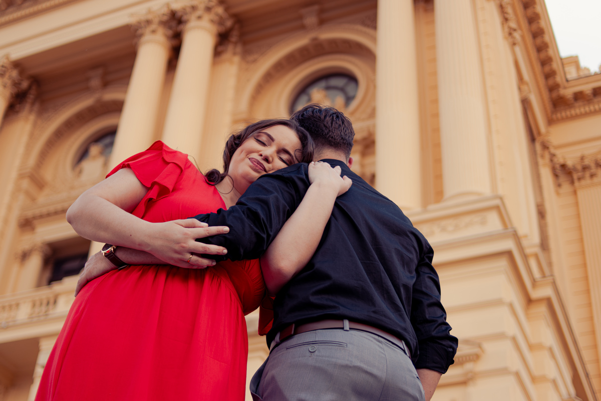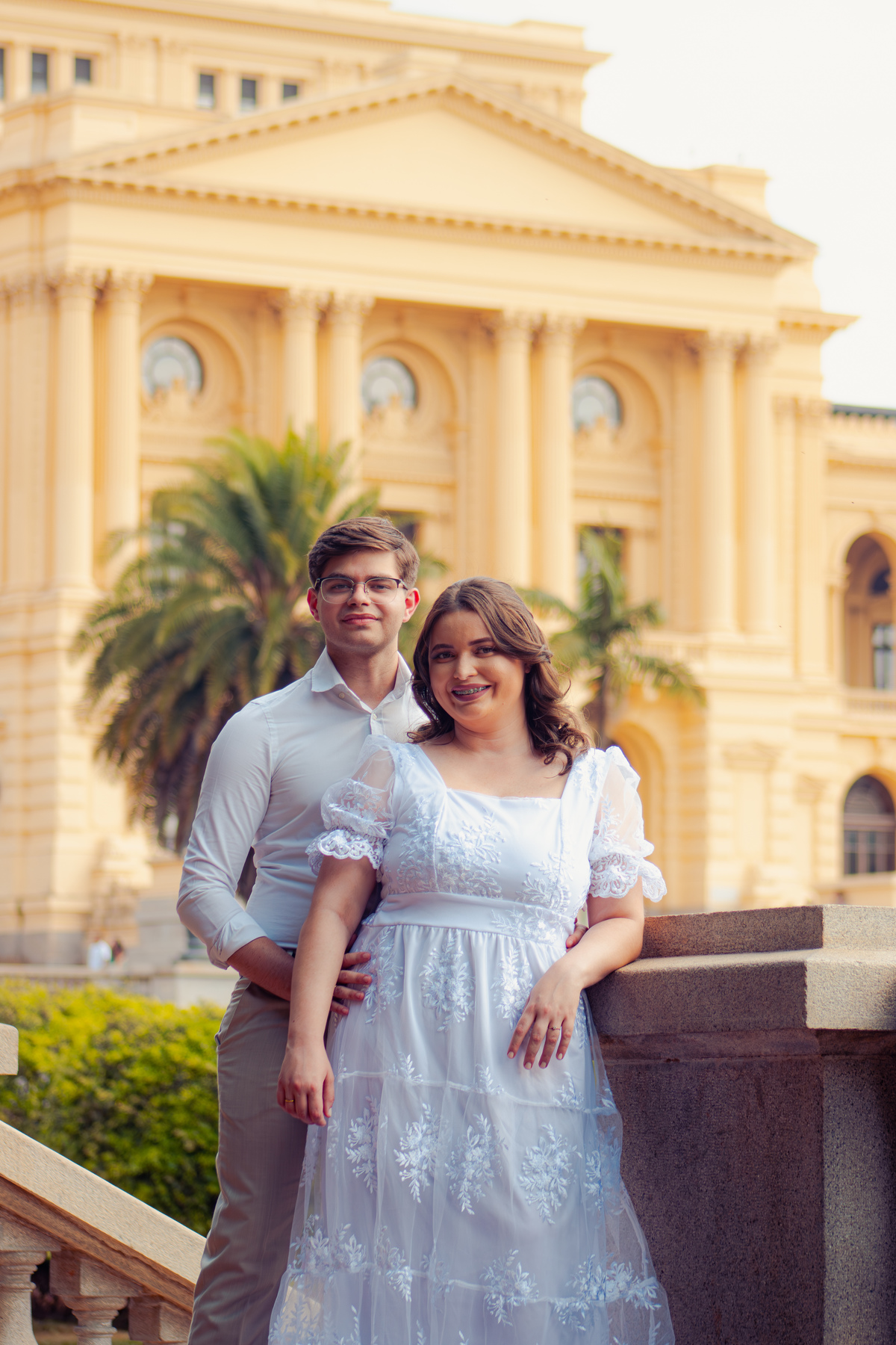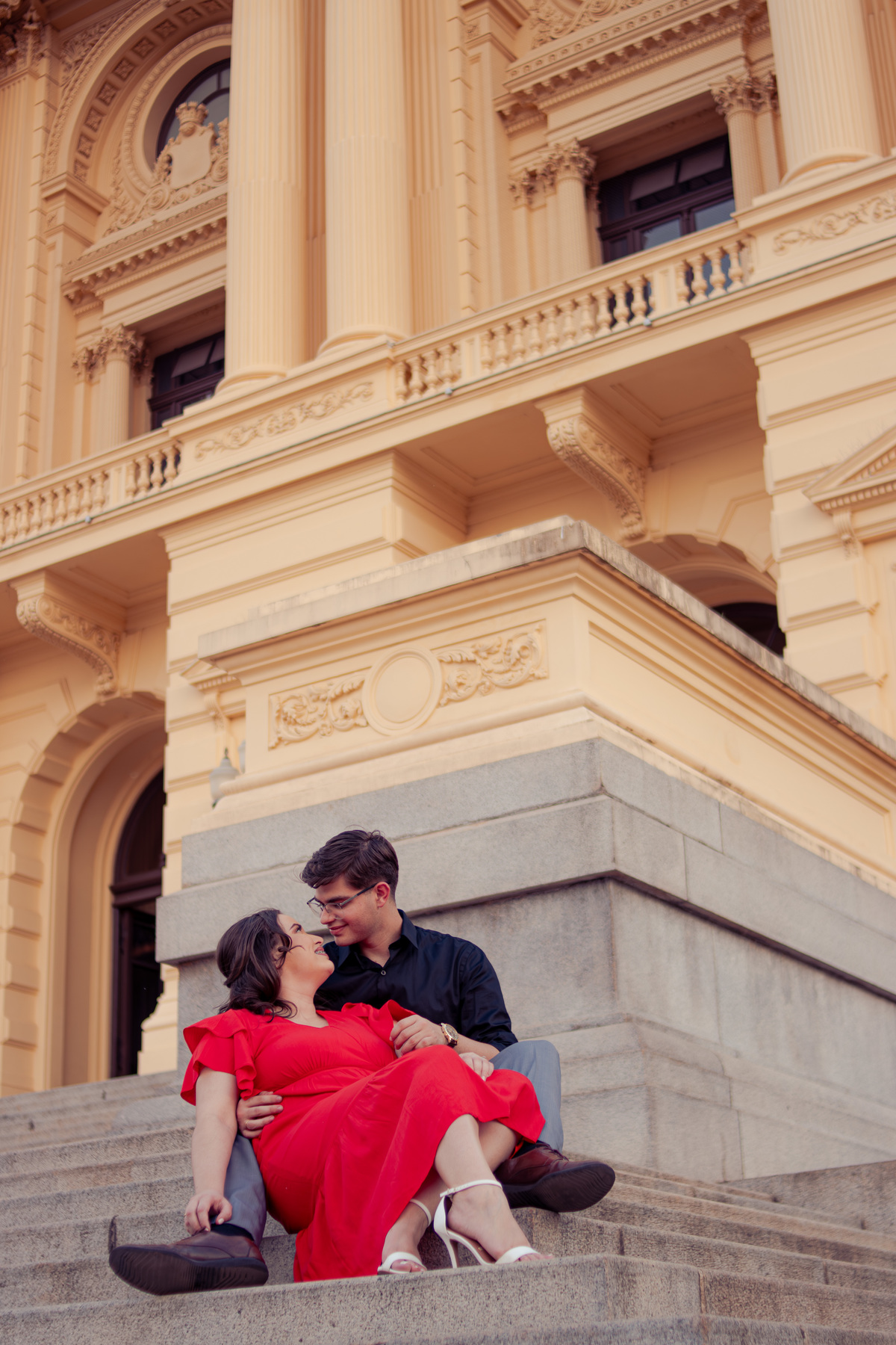 De mãos dadas, entre conversas leves e risadas espontâneas, o ensaio se construiu mais como um passeio do que como uma sessão. A arquitetura clássica serviu de cenário para um sentimento simples e forte: a escolha diária de estar junto.