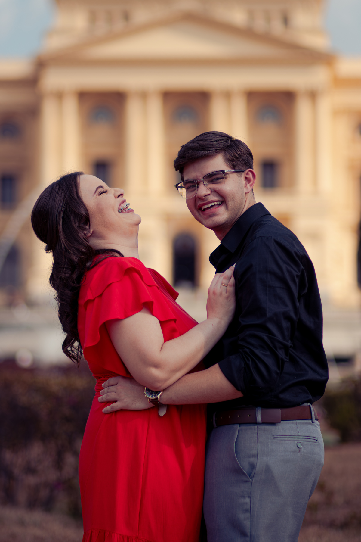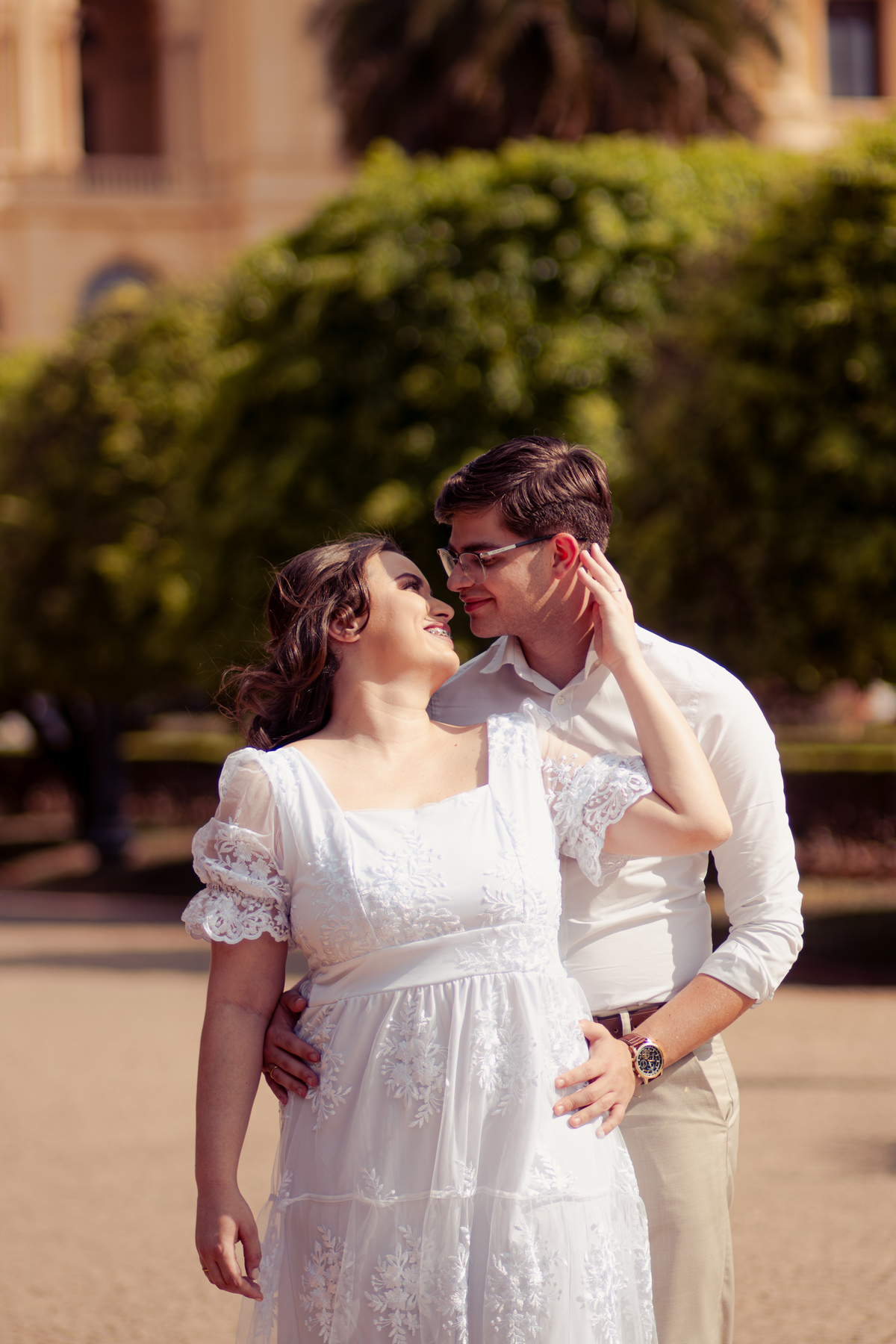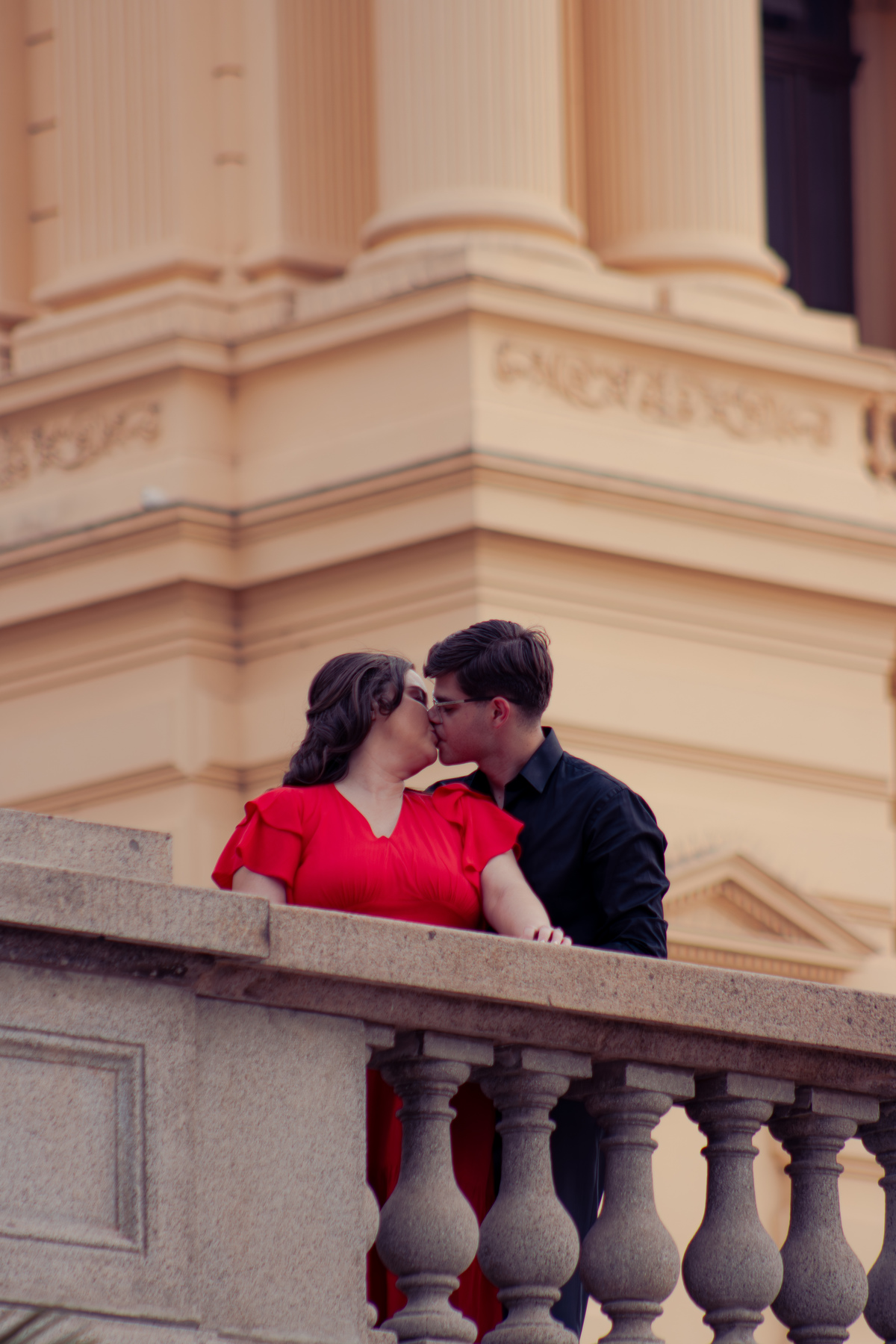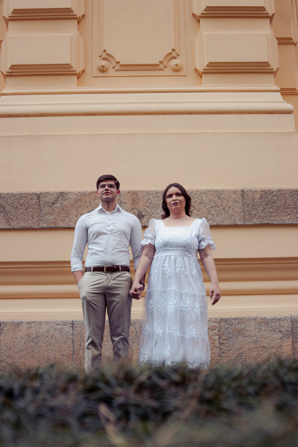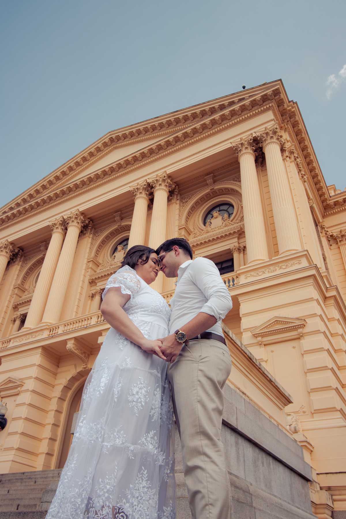 De mãos dadas, entre conversas leves e risadas espontâneas, o ensaio se construiu mais como um passeio do que como uma sessão. A arquitetura clássica serviu de cenário para um sentimento simples e forte: a escolha diária de estar junto.